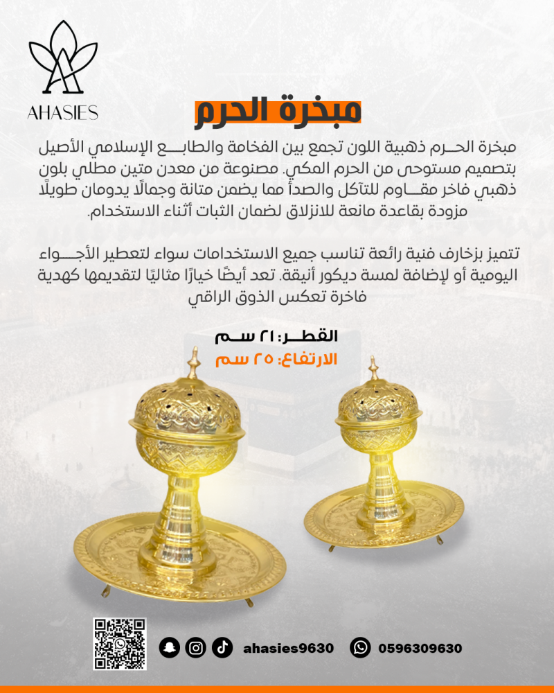 مبخرة الحرم ذهبية اللون تجمع بين الفخامة والطابع الإسلامي الأصيل بتصميم مستوحى من الحرم المكي. مصنوعة من معدن متين مطلي بلون ذهبي فاخر مقاوم للتآكل والصدأ مما يضمن متانة وجمالًا يدومان طويلًا.